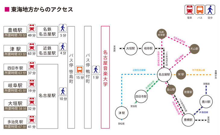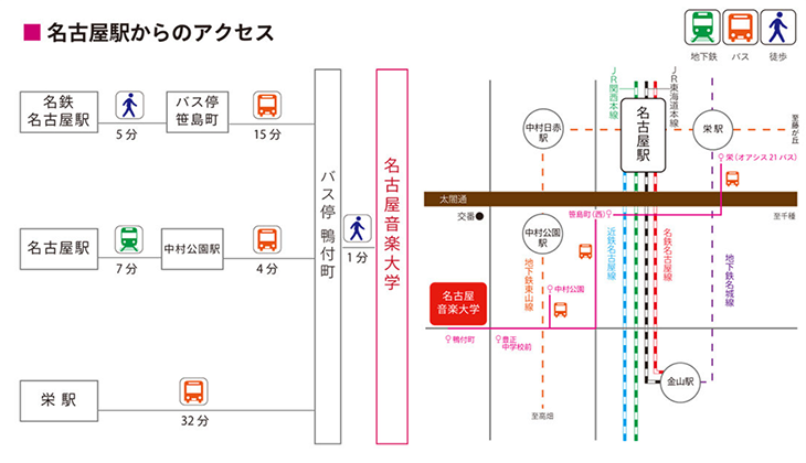 名古屋駅からの直線距離は約3.6キロメートルで、名古屋駅にもっとも近い大学です。名古屋の中心街までバスや地下鉄で直接アクセスでき、演奏会などにも安易に足を運ぶことができます。名古屋市内にある唯一の音楽大学だからこそのメリットです。
