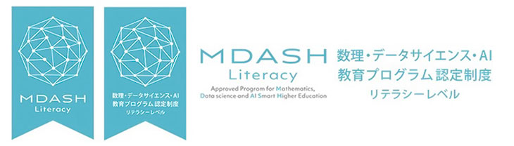 本学では、数理・データサイエンス・AIへの関心を高め、適切に理解し活用する基礎的な能力を育成することを目的とした「数理・データサイエンス・AI 教育プログラム」を開設しています。本プログラムは、優れた教育プログラムを文部科学大臣が認定・選定する「数理・データサイエンス・AI教育プログラム認定制度」の認定を受けています。
